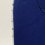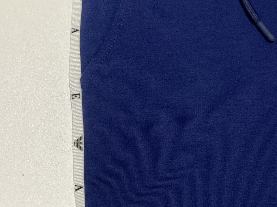 Electric blue cotton jogger pants for boys aged 4 to 8 years, kids’ clothing by the luxury brand Emporio Armani. The pants have elasticated waist and side bands with white Eagle logo.