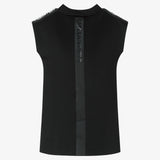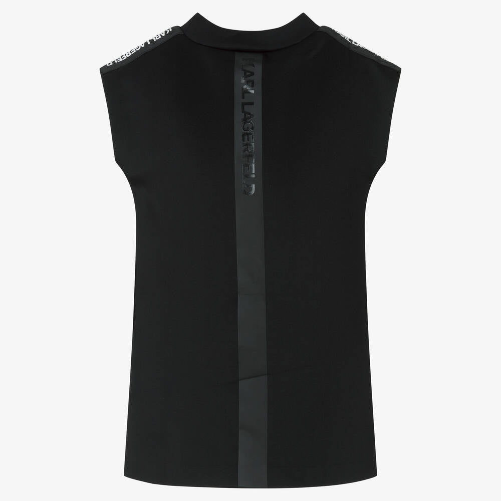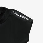 A structured black dress for girls with side openings, extended shoulders and a mock neck stretch. Designer girls dresses from Karl Lagerfeld.