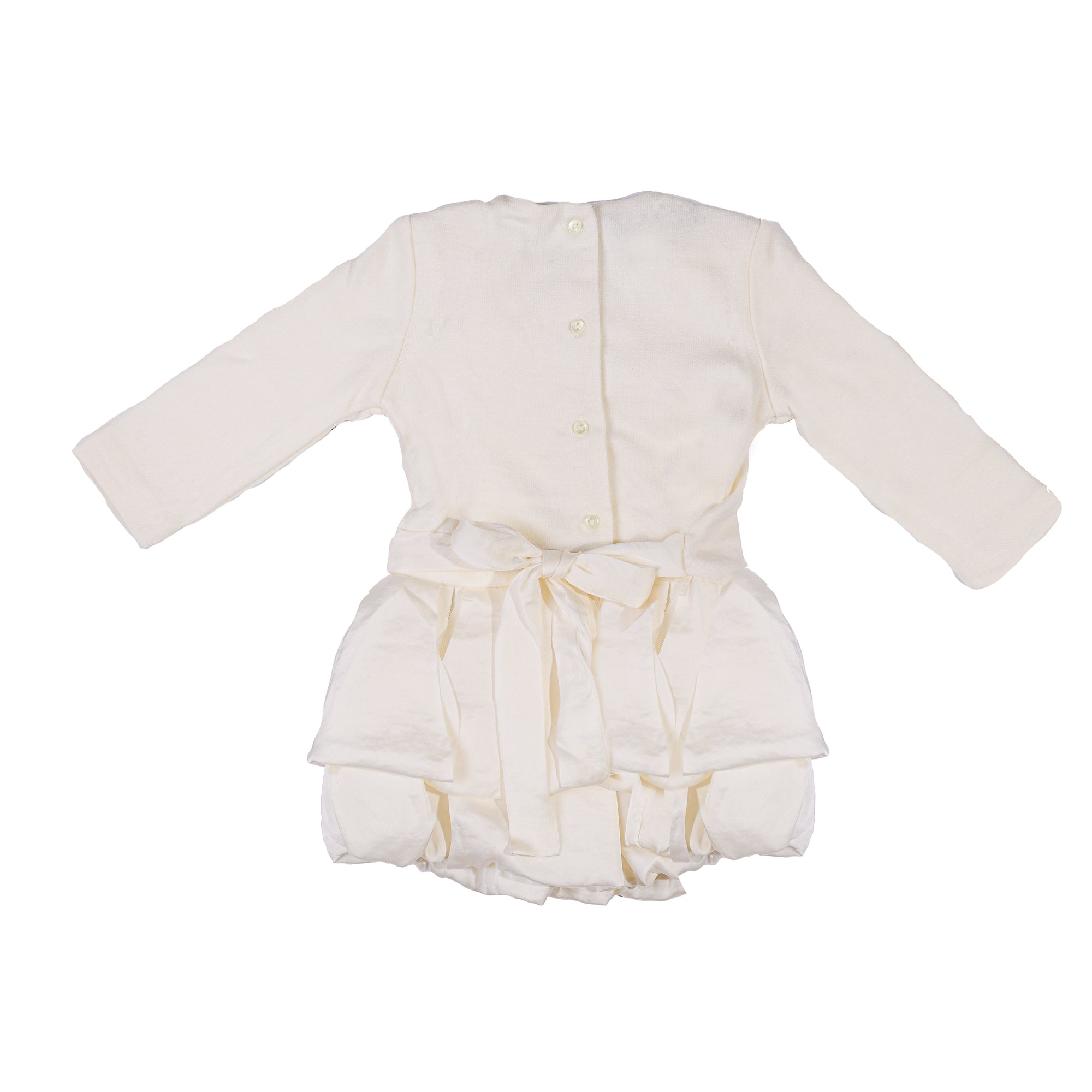 The dress top is crafted from knit fabric adorned with adorable flower appliques made of satin and pearl studs. The skirt features two layers for a balloon effect, accompanied by a satin belt that ties at the back.