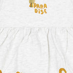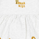 Sleeveless bodysuit dress for baby girls by Losan. This beige cotton dress features a crisp white fabric adorned with adorable baby animal prints on the front.