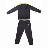 Sporty jogging for boys made in soft dark grey fabric with lime green lining on the hood and pockets.The pants are adjustable at the waist thanks to the drawstrings