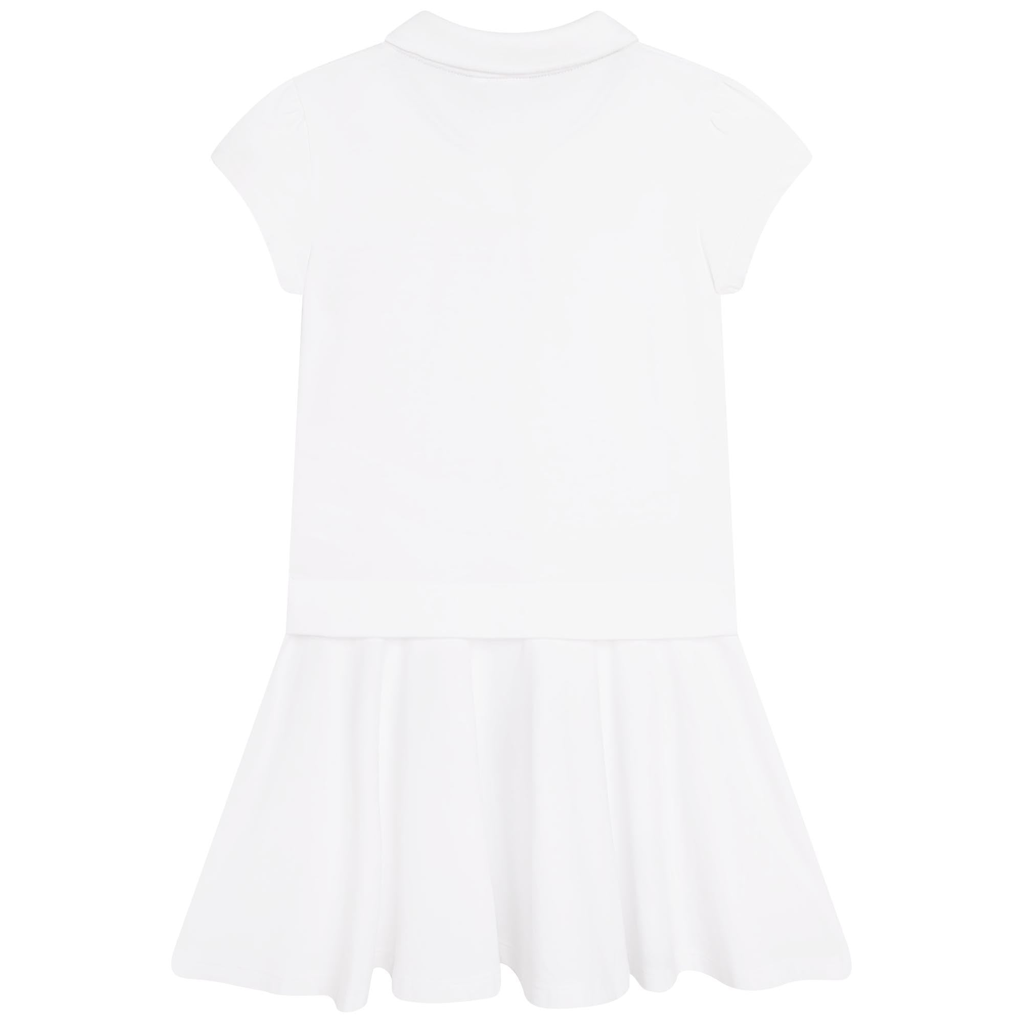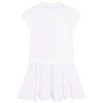 White polo dress in a piqué cotton by the luxury brand Boss. Short sleeves polo collar dress, mid-length breathable dress.