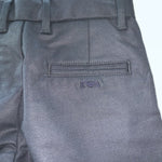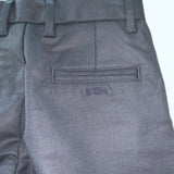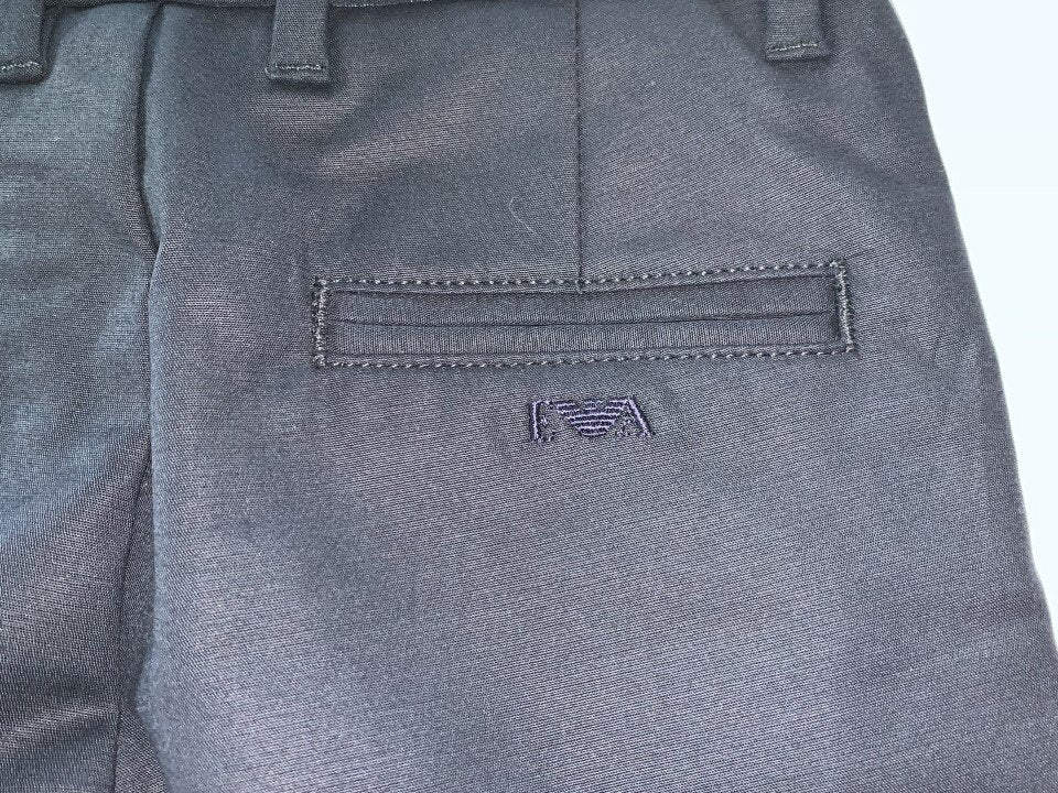 Dressy navy blue pants for boys aged 5 to 16 years, kids’ clothing by the luxury brand Emporio Armani. The pants have adjustable waistbands up to size 10. The brand’s logo is stitched on the back pocket.