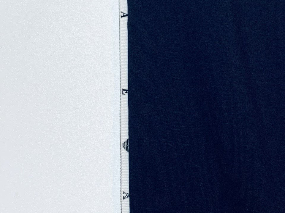 Navy cotton jogging pants for boys aged 10 to 16 years, kids’ clothing by the luxury brand Emporio Armani. The pants have elasticated waist and side bands with white Eagle logo.
