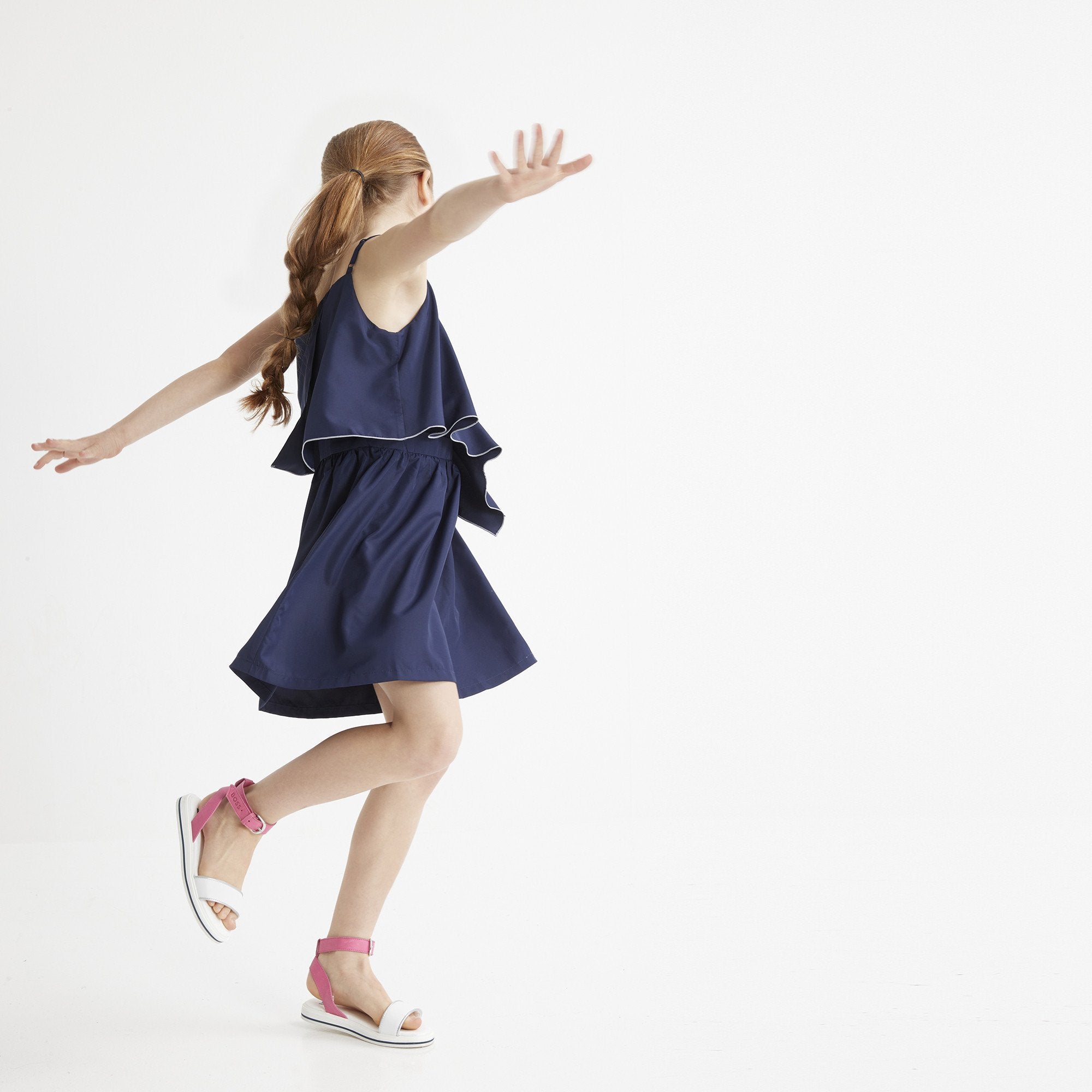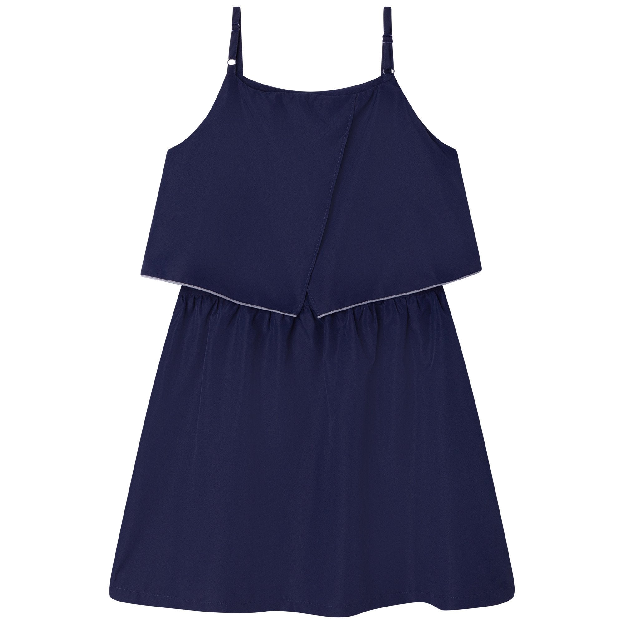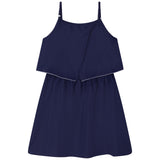 Navy blue summer dress for junior girls by the luxury brand Boss. Ruffle front dress with adjustable straps for a comfortable fit.