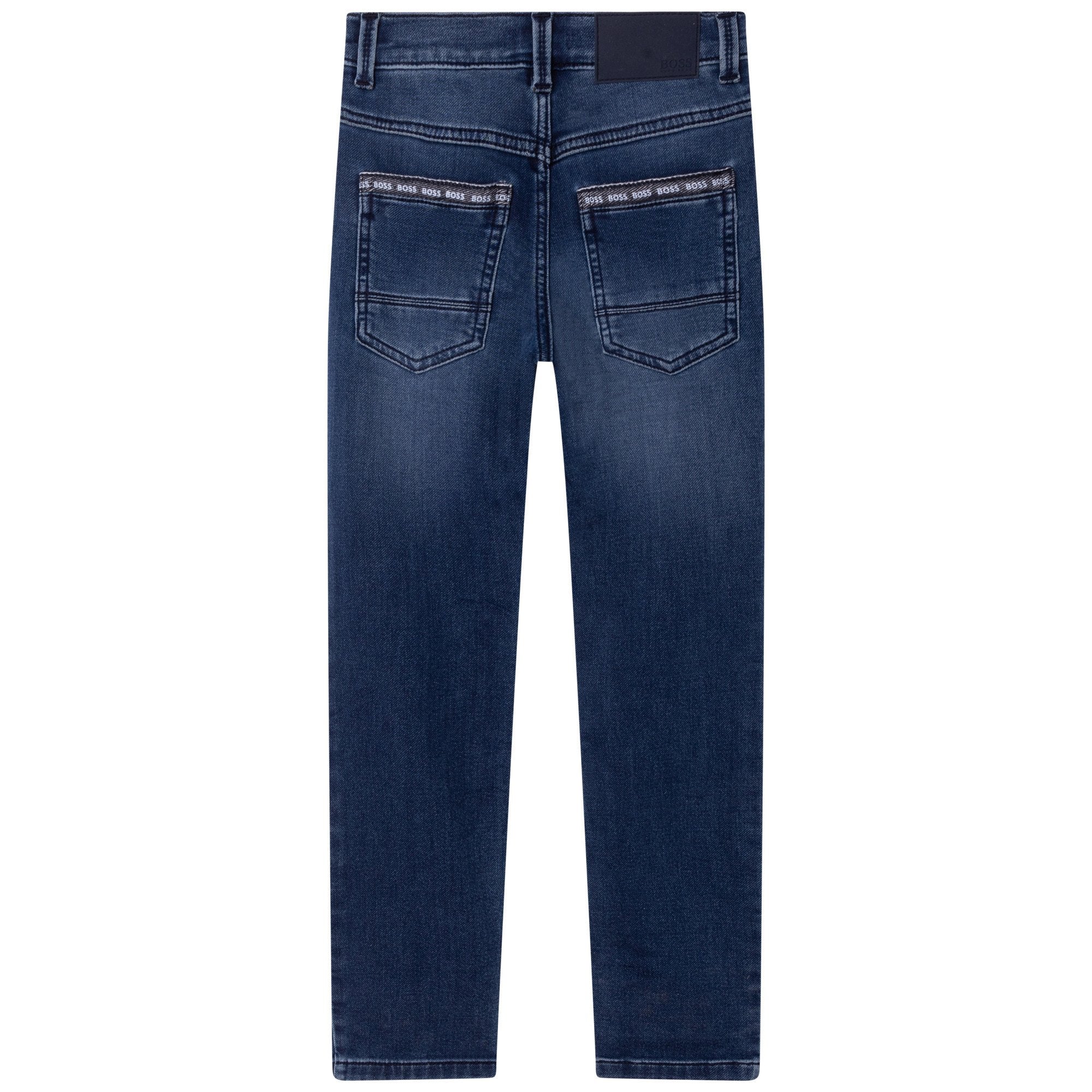 Comfortable ,stretchy and slim fitted joggjeans for junior boys by Boss.Adjustable waistband up to size 10 years.Navy blue band with the brand's logo on the back pockets and the front pocket.